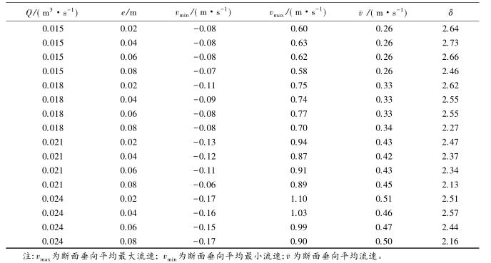 流速沿?cái)嗝娣植嫉木鶆蛱匦钥梢酝ㄟ^(guò)流速分布不均勻系數(shù)進(jìn)行表征,通過(guò)所選取斷面*大流速和*小流速的差值與該斷面平均流速的比值,δ值越大表明浮體結(jié)構(gòu)的存在對(duì)水流斷面流速的分布產(chǎn)生的影響較大。表2中,當(dāng)來(lái)流流量相同時(shí),流速的不均勻系數(shù)多數(shù)隨e的增大而減小。浮體結(jié)構(gòu)位置較小時(shí),主流為浮體結(jié)構(gòu)上部的水流。隨著浮體結(jié)構(gòu)位置的上升,來(lái)自上游的水體逐漸分成浮體結(jié)構(gòu)上部和下部的兩股主流,流速分布的不均性減小。浮體結(jié)構(gòu)位置及所處水位條件相同時(shí),來(lái)流流量的增大,區(qū)域的平均流速增大,因此流速不均勻性減小。