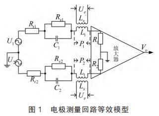 測量電極與流體介質接觸時會發生電化學反應在電極-溶液界面形成阻抗,通常由法拉*阻抗與雙電層電容并聯組成。 法拉*過程分為電荷傳遞過程和擴散過程,相應的法拉*阻抗由電荷傳遞電阻與擴散阻抗串聯組成。一般化工原料流量計的勵磁頻率大于1Hz,而擴散阻抗發生在更低頻率內,不考慮擴散過程,電極等效阻抗為電荷傳遞電阻與雙電層電容并聯后再與電極接觸電阻串聯。 基于電極阻抗建立的電極等效測量回路如圖 1 所示。圖中:Rs1 和 Rs2 為電荷傳遞電阻;C1 和 C2 為雙電層電容;Rt為兩個測量電極間的接觸電阻滿足 Rt=Rt1+Rt2;Lx 為勵磁線圈等效電感;L1 為閉合回路等效電感;R1 和 R2 為放大器輸入電阻;P1和 P2 為由“變壓器效應”疊加在測量電極上的微分干擾;U1 為流體切割磁力線產生的感應電勢;Ue 為勵磁電壓。 假設磁感應強度由勵磁電流決定且成正比關系即 B=aI,忽略串模等干擾則電極間電壓為感應電勢與微分干擾的疊加,基本方程如下:
