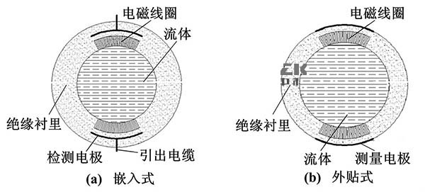 電極與被測流體通過絕緣管形成檢測電容,通過此電容來藕合流量信號。其主要的結構形式按照電極的安裝位置可以分為兩種:電極嵌人測量管的絕緣襯里內部(嵌人式)、電極貼在測量管外部(外貼式)。嵌入式結構與普通一寸管污水流量計結構相似,而外貼式大多是通過陶瓷表面金屬化技術將電極貼在測量管外。
