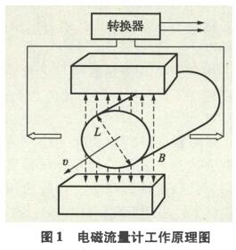 管道地下水流量計是利用法拉*電磁感應定律測量,如圖1所示,用于測量電極與運動的流體構成的回路中產生的電參數,并根據公式換算成流體速度,再測量流通截面液位高度得到流通面積,兩者相乘得到所測流量。