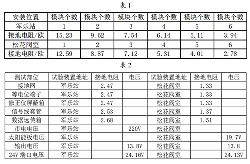 接地網(wǎng)的安裝與連接:接地網(wǎng)是整個乙二醇流量計防雷試驗比較關鍵的一個內(nèi)容,能不能準確的論證試驗的有效性,必須保證接地網(wǎng)達到標準的接地電阻,通過對實地地電阻率的測試,初步選擇6個接地模塊埋設并配用降阻劑使用,邊安裝邊測試直到達到標準值后才引入等電位箱。在軍樂站和松花閥室安裝模塊并測試數(shù)據(jù)見表1。