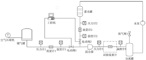 試驗介質由已測定流量的水和空氣組成,分別送入管道混和成氣液兩相流送入試驗管段。試驗裝置如圖1所示。試驗裝置由空氣壓縮機、儲氣罐、蓄水罐、分離罐、流量計、壓力變送器、溫度變送器、工控機和各種閥門組成。