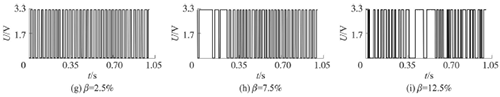 試驗發現,氣相的加入對過熱蒸汽流量計測量的影響顯著,譜分析和脈沖計數兩種方法隨著氣相注入的增加其表現也不同。圖4反映了水流量12m3/h時,注入不同氣含率β時A點的模擬信號,如圖4(a~c)所示;經譜分析后得到的頻率值,如圖4(d~f)所示;用脈沖計數方法得到的脈沖信號,如圖4(g~i)所示。圖4顯示,當注入氣量不大時,對過熱蒸汽流量計的影響不大,無論是譜分析結果還是脈沖計數得到的結果都比較好。當注入的氣量進一步增加時,渦街原始信號強度和穩定性逐漸變差,渦街頻率信號會被干擾信號所淹沒,反映到譜分析圖是,渦街頻率的譜能量減小,干擾信號的譜能量加強;對于脈沖信號,會因為一些旋渦信號減弱,形成脈沖缺失現象,而不能真實地反映渦街產生的頻率。