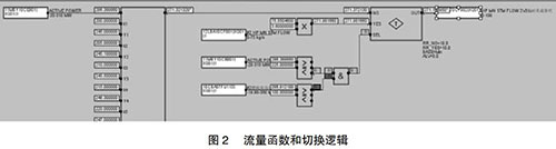 但是由于近期趨勢(shì)可能收集不到部分負(fù)荷段的相關(guān)數(shù)據(jù),在超出現(xiàn)有數(shù)據(jù)負(fù)荷的部分應(yīng)采取必要的補(bǔ)救措施,可以參考相同負(fù)荷運(yùn)行的另一臺(tái)余熱鍋爐的主蒸汽流量,以此來(lái)彌補(bǔ)現(xiàn)有數(shù)據(jù)的不足。為了保證數(shù)據(jù)切換的可靠性,切換條件要嚴(yán)謹(jǐn),現(xiàn)有函數(shù)的負(fù)荷下線上增加25MW與另外一臺(tái)的燃機(jī)負(fù)荷大于100MW。如此設(shè)置的好處是當(dāng)另一臺(tái)運(yùn)行機(jī)組突然故障或跳機(jī)時(shí)保證數(shù)據(jù)能及時(shí)切換到函數(shù)輸出,保證機(jī)組的安全運(yùn)行。具體操作見圖2。