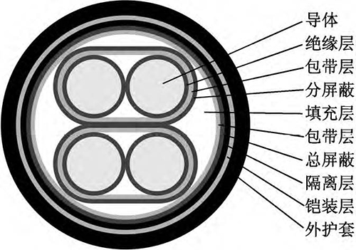 該新型電纜的結(jié)構(gòu)如圖1所示。導(dǎo)體為單股退火鍍錫軟銅線,以提高導(dǎo)體的導(dǎo)電性和防腐蝕性。在導(dǎo)體外繞包一層薄F4(聚四氟乙烯)半導(dǎo)電帶,有利于降低導(dǎo)體和絕緣之間的摩擦起電噪音。絕緣采用材料較為純凈、介電常數(shù)較小、具有一定彈性的聚丙烯絕緣級材料,并采用擠壓式擠出,減小絕緣層與導(dǎo)體的間隙。采用對絞組作為信號傳輸線,由于在兩根傳輸線上感應(yīng)的電壓接近相等,減小了電壓差值,提高了信號傳輸穩(wěn)定性;對絞組由兩種不同顏色絕緣線芯組成,相鄰線對對絞節(jié)距應(yīng)不大于100mm。對絞分屏蔽組(即對對絞組進(jìn)行分屏蔽,每對對絞組外繞包兩層聚酯帶和一層厚0.04mm鋁塑復(fù)合帶繞包,內(nèi)置一根7×0.26mm鍍錫銅絞線作引流線)有利于對不同對絞組之間信號串音的抑制和隔離。對絞分屏蔽組同心式絞合成纜,在對絞分屏蔽組間填充非吸濕性材料,以保證纜芯圓整。在成纜纜芯外繞包兩層聚酯帶,再采用鋁塑復(fù)合帶繞包,內(nèi)置鍍錫銅線作引流線,以提高電纜電磁屏蔽能力。總屏蔽層外擠包隔離層(隔離護(hù)套),隔離層采用絕緣級低密度聚乙烯材料。隔離層外采用鎧裝層,鎧裝材料為高導(dǎo)磁合金鋼帶,其為強磁材料,可將外來的磁通大部分限制在鎧裝層的外表面上(僅有少部分能進(jìn)入被屏蔽的空間);鎧裝時對高導(dǎo)磁合金鋼帶采用縱包焊接,確保其形成一連續(xù)圓柱管;鎧裝層可提高電纜抗電磁干擾水平以及對電纜進(jìn)行加強,減少電纜振動引起的電動勢。外護(hù)套采用藍(lán)色軟PVC(聚氯乙烯)護(hù)層級電纜材料擠包,實現(xiàn)電纜防護(hù)。