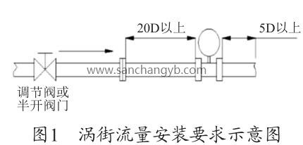 根據(jù)圖1渦街流量安裝要求示意圖及廠家的設備說明書要求,流量計上游的直管段長度至少為20D≈1 600mm,下游的直管段至少在5D≈400mm,D=80mm 為管道直徑。圖2為現(xiàn)場安裝圖,流量計上游僅為600mm <1 600mm,此流量計安裝位置有誤,對測量值有一定的影響,造成測量偏差,需調整流量計的安裝位置。