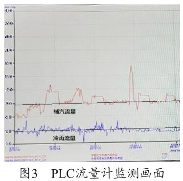 通過圖3 PLC 流量計監(jiān)測畫面可以看出,PLC 上輔汽測量用的煙氣流量計的量程設置為30t/h,現(xiàn)場設備量程實際為6t/h,兩者嚴重不符,因此測量值4t/h 為錯誤值(單臺機組運行),需要對程序進行修改。