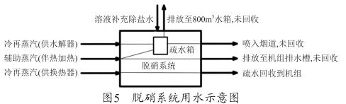 從圖5可以看出,脫硝系統(tǒng)所使用的冷再蒸汽和輔助蒸汽換熱后全部冷凝為疏水,供水解器的蒸汽和部分伴熱加熱的蒸汽回收至脫硝系統(tǒng)的疏水箱,部分伴熱蒸汽疏水直接排放至機組排水槽,未進行回收。疏水箱的水一部分被脫硝系統(tǒng)利用,另一部分排放至機組800m 3 水箱,未進行回收。下面結合耗水量對蒸汽耗量進行判斷 :