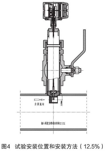 根據中華人民共和國機械行業標準:JB/T9249-2015《煙氣流量計》進行插入式煙氣流量計的研制與設計。在試驗過程中,因為理論研究不充分,再加上經驗不足,采用插入深度是按照以往其它產品(插入式電磁流量計)的經驗,以插入深度為現場管道內徑的 12.5% 進行試驗,其對介質流量的檢測值與同種規格管道法蘭式結構的煙氣流量計進行比較,偏差值較大、儀表準確度無法滿足設計要求。試驗安裝位置和安裝方法如圖 4 所示。