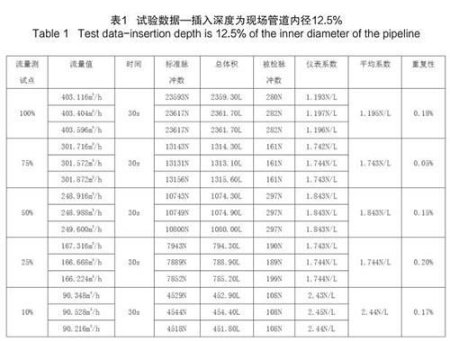 插入式煙氣流量計插入深度為現場管道內徑的 12.5%時,試驗數據如下(以 DN200 為例):