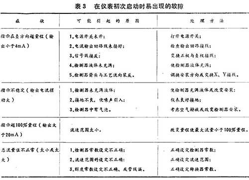 在儀表指示不正常時,可根據下面介紹的一些典型故障和處理方法進行必要的處理。這些故障可分為啟動時易產生的故障,正常運行時出現的故障和接地不良引起的故障(見表3、表4)。