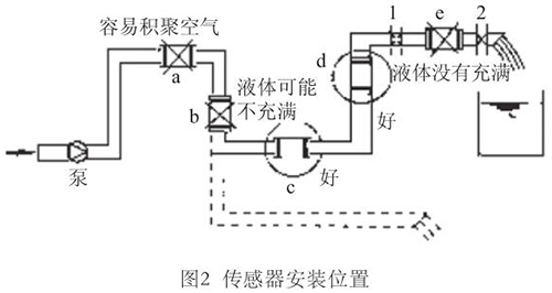 液體流動方向必須與傳感器殼體上箭頭方向一致。對于能正反向測量的液氮流量計,若方向不一致雖仍可測量,但設定的顯示流動正反方向不符,必須改正之。若拆傳感器工作量大,也可改變傳感器上箭頭方向和重新設定顯示儀表符號。管道未充滿液體主要是管網(wǎng)工程設計或傳感器安裝位置不妥,使傳感器測量管內不能充滿液體。應采取措施,避免安裝如圖2所示a,e位置和以虛線管排放時b位置,改裝到c,d位置。