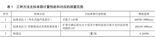 本規范包含三種校準方法,分別為標準表法 1(外夾式超聲流量計)、標準表法 2(串聯移動式在線校準裝置)和稱重法,編制組對每種方法進行了大量的實驗,并積極與丙酮流量計生產廠家及用戶溝通探討,積累了豐富的經驗,獲得了大量的實驗數據,*終確定三種方法的主標準器計量性能和對應的測量范圍,如表 1 所示。