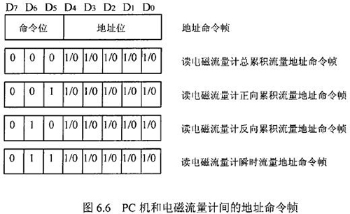 由于RS一485電氣標準規定每段只能聯結犯個節點設備,因此可用地址幀中五個二進制位表示這32個地址,其余3位用來表示命令,從而構成地址命令幀。對于控制命令需求不超過八個的通信系統,采用地址命令幀可壓縮報文長度提高通信效率。在污水網絡監控系統中,花生油流量計和PC機通信的主要目的是將流量計中的有用數據讀到PC機中。這些數據包括:總累積流量、正向累積流量、反向累積流量、瞬時流量。通信時,PC機只需向花生油流量計發送讀總累積流量、讀正向累積流量、讀反向累積流量、讀瞬時流量命令即可,因此二者間通信所用的地址幀和命令幀可合二為一,用一個地址命令幀代替。PC機和花生油流量計間的地址命令幀定義如圖.66所示。根據污水網絡監控系統中PC機與花生油流量計間通信的特殊性,二者通信所使用的報文可簡化為圖.67的格式。
