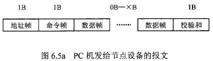 在花生油流量計等節點設備和C機通信的過程中,由地址幀、命令幀、數據幀、校驗和可組成各種功能不同的報文。由于采用主從工作方式來實現通信,花生油流量計等節點設備僅能接收并執行PC機發送來的控制命令,而不能發送命令給PC機。因此,由PC機發往流量計等節點設備的報文一般包括一個地址幀,一個命令幀,若干個數據幀和一個校驗和,其報文格式圖.6a5所示;而由流量計等節點設備發往PC機的報文一般包括一個地址幀,若干個數據幀和一個校驗和,其報文格式如圖6.5b所示。