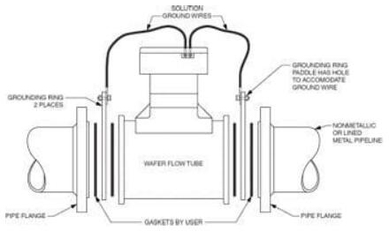 晶片式流量管:將晶片式流量管安裝在非金屬,塑料,PVC或帶襯里的工藝管道之間時,需要接地環。必須通過將隨附的隨附的SG連接線連接到接地環,將SG傳遞到流量管的主體/外殼上(圖6.)。
