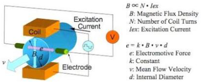 基本上,當導(dǎo)電液體流過磁場時,會感應(yīng)出電壓。為了測量該產(chǎn)生的電壓(與流動的液體的速度成正比),使用了兩個彼此相對安裝的不銹鋼電極。