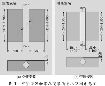 (1)要確認(rèn)在用智能液體流量計(jì)的管壁厚度及內(nèi)襯材料特性,保證換能器在管段內(nèi)壁的突出長(zhǎng)度;(2)用氣焊切割智能液體流量計(jì)外殼時(shí),一定要在管道內(nèi)充滿水的情況下(*好是帶壓并繼續(xù)保持管內(nèi)水在運(yùn)行流動(dòng)的狀態(tài))進(jìn)行,以免內(nèi)襯受熱凸起變形影響流態(tài);(3)要有足夠安裝空間(流量井),可以用原有的流量井,但管壁與流量井墻壁*小距離不小于 500 mm,流量井長(zhǎng)不小于 1. 5 倍管徑。超聲波流量計(jì)空管安裝和帶壓安裝要求空間如圖 1 所示。