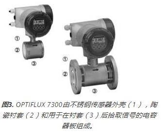 所述OPTIFLUX 7300是一個EMF設有陶瓷襯墊,非潤濕電容電極和IFC 300轉換器(圖3)。電極是安裝在陶瓷襯里后面的大面積電容器板。非接觸式電容信號拾取是OPTIFLUX 7300的另一個優勢,它消除了金屬組件不必要的催化作用。另外,電極的絕緣確保安全。