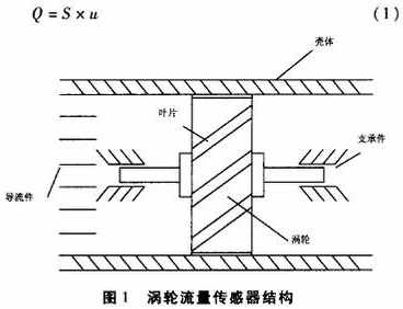 渦輪流量傳感器結(jié)構(gòu)如圖1所示,屬于速度式流量傳感器。渦輪置于流體通道中,隨著流體的流動(dòng)產(chǎn)生旋轉(zhuǎn),設(shè)渦輪的轉(zhuǎn)速為n、流過渦輪的流體速度為u,則n與u成正比;流體通道的流通截面.積S是已知的常數(shù),所以,流過渦輪流量傳感器的流體體積流量Q為: