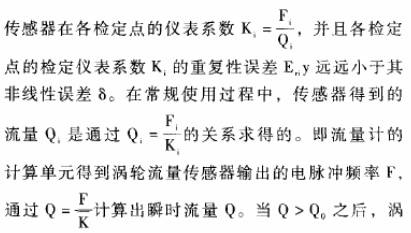 對(duì)于重復(fù)性很好而線性度較差的渦輪流量傳感器,要擴(kuò)大其測(cè)量范圍或減小測(cè)量誤差,研究的核心問題是設(shè)計(jì)一-種便捷的使用方法,按照行鑒定規(guī)程利用原有檢定數(shù)據(jù),使渦輪流量傳感器在具有很小重復(fù)性誤差的流量范圍內(nèi),都能得到很準(zhǔn)確測(cè)量效果。