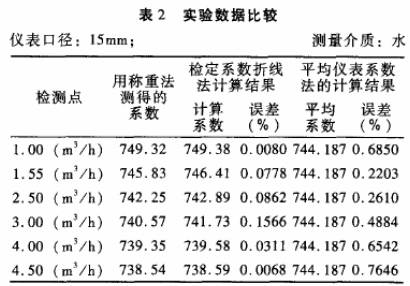 被檢儀表:公稱通徑分別為10mm和15mm的渦輪流量傳感器各一臺(tái);檢定裝置:靜態(tài)稱重法標(biāo)準(zhǔn)水流量檢定裝置,系統(tǒng)精度+0.2%。分別采用常規(guī)的平均儀表系數(shù)法和檢定系數(shù)折線法進(jìn)行標(biāo).定,并與作為標(biāo)準(zhǔn)的靜態(tài)稱重法的檢定結(jié)果進(jìn)行比對(duì),結(jié)果見表1.表2。