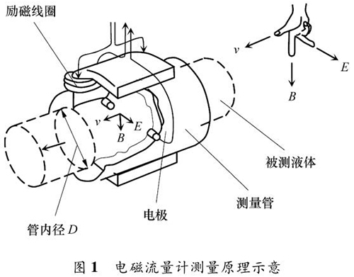 液體流量計的測量原理如圖 1 所示。根據(jù)法拉*電磁感應定律,導電液體在磁場中流動會產(chǎn)生電動勢 E,它與磁感應強度 B、導電液體平均流速 v 成一定比例關(guān)系: