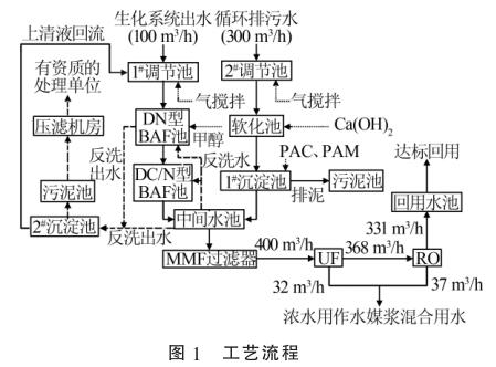 2種廢水在中間水池混勻后,通過泵提升進(jìn)入保安過濾器,進(jìn)一步去除細(xì)小的懸浮物后經(jīng)過增壓泵進(jìn)入超濾膜(UF)處理系統(tǒng)和反滲透(RO)系統(tǒng),然后通過渦輪流量計(jì)進(jìn)行計(jì)量。反滲透出水直接進(jìn)入回用水池達(dá)標(biāo)回用,超濾濃水以及反滲透濃水用作水煤漿混合用水。污泥池中的污泥通過泵打入帶式機(jī)壓濾處理,濾液自流進(jìn)入1#調(diào)節(jié)池。工藝流程見圖1。