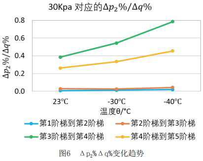 為了更直觀嚴謹的對比每個階段響應速度的不同,對原始數據進行處理,得到如下表格2和表格3。將△p2%/△q%作為響應速度的直觀量化表達,若△p2%/△q%的值大,說明單位流量變化照成的出口壓力變化大,即說明分體式電磁流量計響應相對較慢,反之亦然。