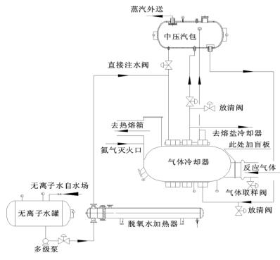 來自無離子水罐的脫氧水經多經泵加壓、經脫氧水加熱器加熱后進入到智能型渦街流量計的水段,脫氧水與反應氣體換熱后分兩路:一路進入中壓汽包,保證汽包有穩定的液位;一路進入熔鹽冷卻器帶出熔鹽攜帶的反應熱。來自中壓汽包的高溫水經管路接至智能型渦街流量計汽段底部,高溫水與反應氣體換熱后產生高壓蒸汽,高壓蒸汽又返回中壓汽包。汽包還有一路直接注水管路,此路水不經過智能型渦街流量計水段,而是直接進入汽包。在智能型渦街流量計出口溫度偏低而汽包液位也比較低時,可開此直接注水管路來穩定汽包液位。其詳細流程圖如圖 2。
