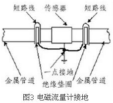 (4)盡量避開振動源、磁源(大功率電機、變壓器)由于流量計的測量感應電壓很小,電壓較低,易受外界電磁噪聲的影響,故在安裝時應進行可靠的接地連(跨)接。金屬管道流量計接地連(跨)接方法如圖3所示