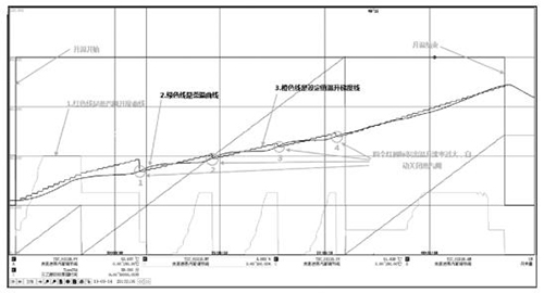 全過程升溫曲線見圖 2,從圖 2 可以看出,通過上述工藝參數(shù)的設(shè)定,從升溫開始到升溫結(jié)束,管道式流量計(jì)溫基本上是按照溫升梯度進(jìn)行升溫,當(dāng)出現(xiàn)溫升速率太快時(shí),蒸汽閥自動(dòng)關(guān)閉,無需人工參與,可以自動(dòng)控制管道式流量計(jì)料液溫度的平緩上升,實(shí)現(xiàn)脫溶單元操作自控運(yùn)行。