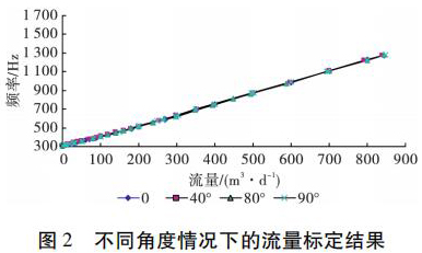 為了考察井眼斜度變化對電磁流量計(jì)測量流量的影響,開展了非集流高壓電磁流量計(jì)在不同斜度情況下的流量測量模擬實(shí)驗(yàn)。模擬實(shí)驗(yàn)在大慶油田多相流實(shí)驗(yàn)室進(jìn)行,儀器外徑 38 mm,模擬井筒內(nèi)徑為 124 mm,實(shí)驗(yàn)介質(zhì)是水,傾斜角度分別為 0°、40°、80°和 90°( 水平) ,流量范圍為 5 ~ 850 m3 /d。實(shí)驗(yàn)結(jié)果表明,在儀器居中條件下,井眼斜度變化對電磁流量計(jì)的儀表常數(shù)沒有影響,滿量程誤差不大于 4% ,因此可以應(yīng)用高壓電磁流量計(jì)進(jìn)行水平井注水剖面測量。不同角度情況下的實(shí)驗(yàn)結(jié)果如圖 2 所示。