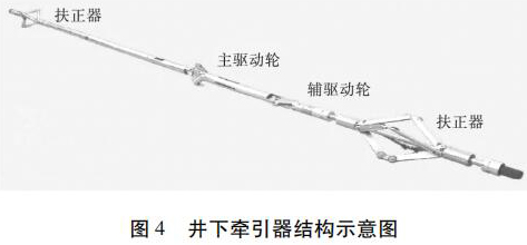 水平井注水井注入剖面測井工藝原理如圖 3 所示。在垂直井段,儀器在重力作用下可以通過注入管柱下入到井內(nèi),注入管柱下端須裝有喇叭口,且喇叭口應(yīng)在造斜點(diǎn)以上,保證測井完成后儀器順利起出,不發(fā)生卡儀器問題。儀器通過喇叭口以后在重力作用下繼續(xù)向下移動,當(dāng)儀器不能靠重力下移時(shí),啟動牽引器,利用牽引器將儀器推送到井底,上提電纜過程中進(jìn)行測井。