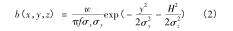 式中: b(x,y,z) = w × e(x,y,z),其中 e(x,y,z) 為二氧化硫濃度與循環流化床火炬氣流量計煙氣排放源煙氣強度的比例系數;f 為平均風速,m/s; w 為地面空氣內煙氣排放強度;σ x 為橫向擴散系數受環境穩定度與下風向距離因素的影響程度。式(3)中描述的是基于時間變化的循環流化床火炬氣流量計煙氣排放源煙氣排放強度計算模型。