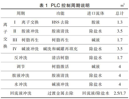 APU 的運(yùn)行按照事先設(shè)定的程序運(yùn)行,即嚴(yán)格遵循設(shè)定的步驟順序。 APU 的正確運(yùn)行依賴于每個(gè)步驟的順利完成。 按照預(yù)先設(shè)定好的步驟完成 1 個(gè)任務(wù)即視為完成 1 個(gè) APU 運(yùn)行的“周期”。 離子交換的主周期被稱為“離子交換周期”。除此之外,整個(gè)控制程序還包含另外 5 個(gè)輔助周期, 分別為反沖洗周期、調(diào)節(jié)周期、胺液沖洗周期、水沖洗周期、回流液沖洗周期。 這 5 個(gè)周期在維護(hù)和非計(jì)劃停車后重新啟動(dòng)時(shí)使用。 PLC 控制各個(gè)周期的說明見表 1。