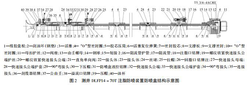 如圖 2 所示,DLFP14 - 70T 注脂防噴盒有 1 個注脂口、1 個回脂口、1 個防噴盒液控口、1 個刮纜器液控口及1 個溢流口,主體內(nèi)裝有 6 根阻流管。DLFP14 - 70T 注脂防噴盒采用 4 級密封: * 1 級密封采用注脂密封,撬裝注脂泵從注脂口注入高壓高粘度密封脂于 6 根阻流管與電纜間隙; * 2 級密封采用液壓密封,氣動液壓泵主加壓和手壓泵補加壓結(jié)合從防噴盒液控口注入液壓油,推動活塞擠壓膠芯壓筒; * 3 級密封采用液壓密封,手壓泵加壓從刮纜器液控口注入液壓油,推動活塞擠壓膠芯壓筒實現(xiàn)密封和刮油作用; * 4 級密封油杯、橡膠盤根和刮油環(huán)( 鋼 墊) 。DLFP14 - 70T 注脂防噴裝置配有液控上、下捕捉器、液控雙閘板防噴器和放噴組件,根據(jù)實際可以調(diào)整溢流量,實現(xiàn)零溢流密閉測井施工。 DLFP14 - 70T 注脂防噴裝置工作壓力 70 MPa,耐壓105 MPa。