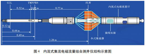 1. 2 內(nèi)流式集流智能型渦輪流量計如圖 4 所示,內(nèi)流式集流電磁組合測井儀主要采用內(nèi)流式集流智能型渦輪流量計,并組合了井溫壓力磁定位儀。利用電磁感應(yīng)原理測量平均流速,體積流量計算公為: