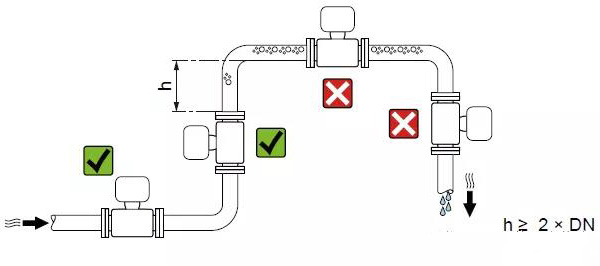 管路必須完全充滿液體。保證管路始終充滿液體至關重要,否則流量顯示會受到影響,而且還會出現測量錯誤。管路結構的設計必須要保證測流管始終充滿流體。當流體有分流或含有固體顆粒沉淀物時,建議使用垂直安裝。但采用垂直安裝時,要遵循流體從下到上的走向,以保證管路充滿流體。