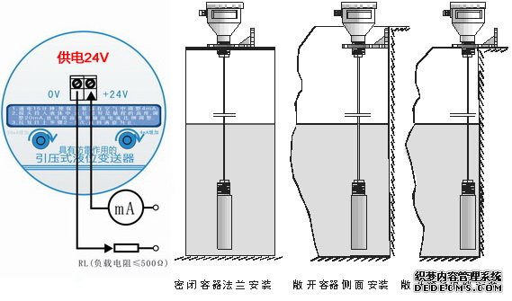 在靜態液位中安裝方法:在敞口的容器中測量靜態液位時,把單法蘭靜壓液位計的探頭直接投入到容器底部,在容器開口處用尼龍帶或三腳可調安裝架等將電纜線(接線盒)固定即可。