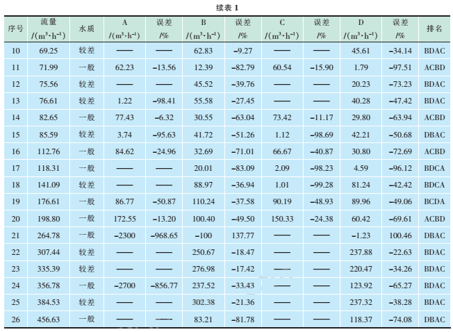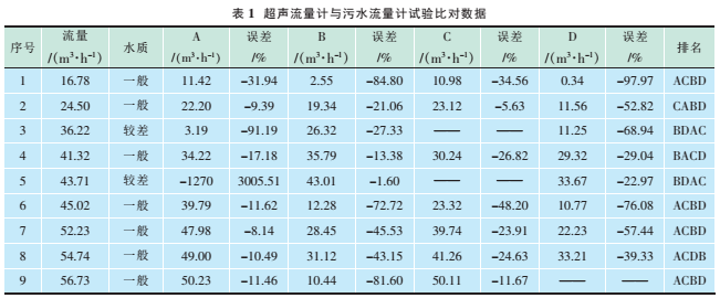 試驗數據見表1,其中流量表示污水流量計60min內的累計流量;A、B、C、D分別為4個型號的超聲波流量計在60min內的累計流量;排名為與同一臺污水流量計比對的4臺超聲波流量計的誤差按從小到大的順序。