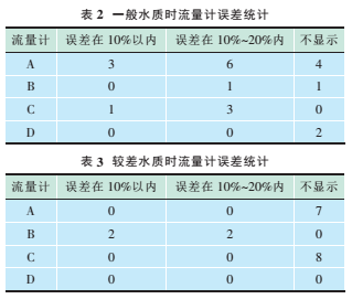 從表2和表3發現,試驗中水質一般(濁度<50mg/L)的情況下,時差法流量計的有效數據(誤差<20%)為13個,占總試驗數據(32個)的40.63%;不顯示的情況有4個,占總試驗數據(32個)12.5%的。水質較差(濁度≥50mg/L)的情況下,多普勒法流量計的有效數據(誤差<20%)為4個,占總試驗數據(32個)的12.5%;該類型流量計不存在不顯示的情況。