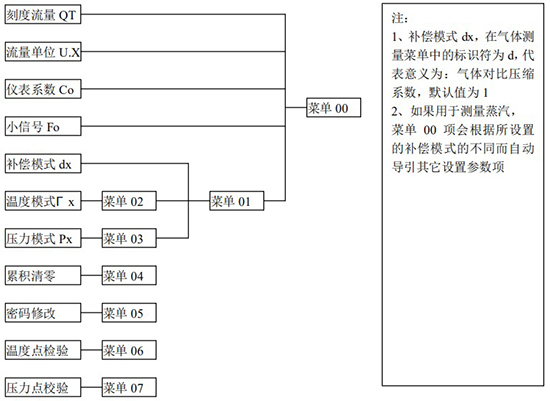 3.1、本儀表表頭采用自導(dǎo)引式和菜單式相結(jié)合的參數(shù)設(shè)置方式,所謂自導(dǎo)引式參數(shù)設(shè)置方式就是用戶在進(jìn)入菜單 00 項(xiàng)后,表頭中的微電腦會自動導(dǎo)引用戶去設(shè)置需要設(shè)置的參數(shù)。另外,用戶也可以通過菜單模式分別對各組參數(shù)進(jìn)行設(shè)置。蒸汽測量菜單框圖如下: